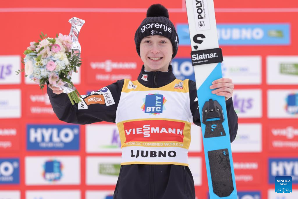 Gold medalist Nika Prevc of Slovenia poses for photo after the Women's Normal Hill HS94 Individual at the Viesmann FIS Ski Jumping World Cup in Ljubno, Slovenia, Feb. 16, 2025. (Photo by Zeljko Stevanic/Xinhua)