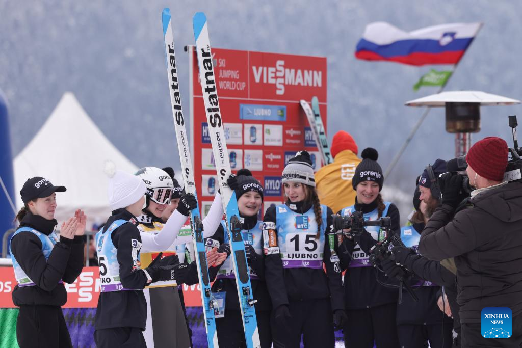 Nika Prevc (3rd L) of Slovenia celebrates after the Women's Normal Hill HS94 Individual at the Viesmann FIS Ski Jumping World Cup in Ljubno, Slovenia, Feb. 16, 2025. (Photo by Zeljko Stevanic/Xinhua)