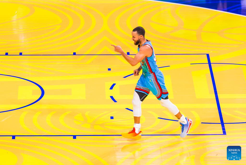Shaq's OGs' Stephen Curry of Golden State Warriors celebrates during the 2025 NBA All Star Game between Shaq's OGs and Chuck's Global Stars in San Francisco, the United States, Feb. 16, 2025. (Photo by Dong Xudong/Xinhua)