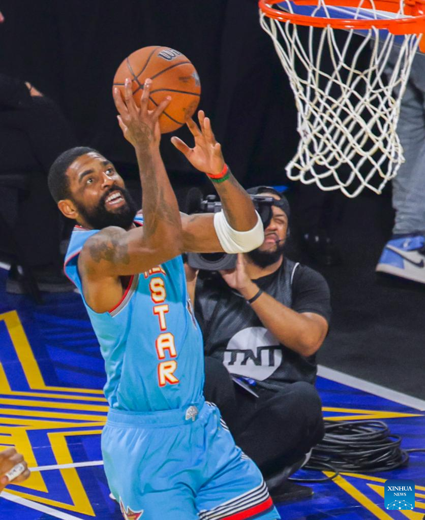 Shaq's OGs' Kyrie Irving of Dallas Mavericks goes to the basket during the 2025 NBA All Star Game between Shaq's OGs and Chuck's Global Stars in San Francisco, the United States, Feb. 16, 2025. (Photo by Dong Xudong/Xinhua)