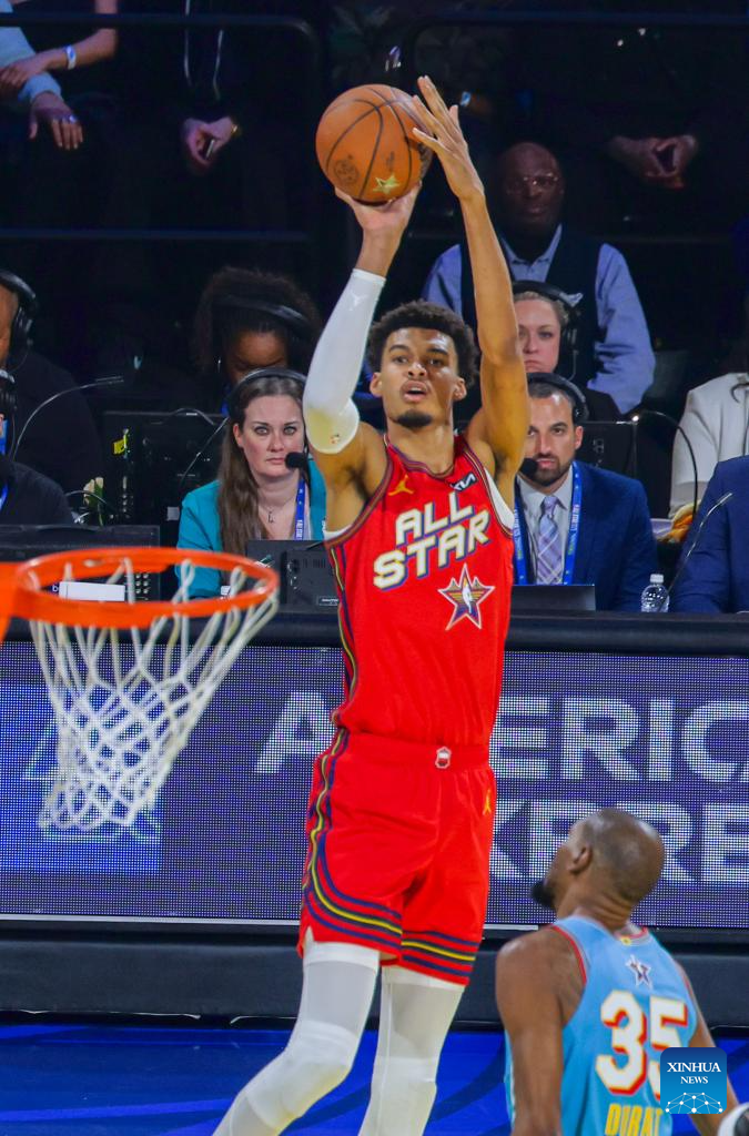 Chuck's Global Stars' Victor Wembanyama of San Antonio Spurs shoots during the 2025 NBA All Star Game between Shaq's OGs and Chuck's Global Stars in San Francisco, the United States, Feb. 16, 2025. (Photo by Dong Xudong/Xinhua)