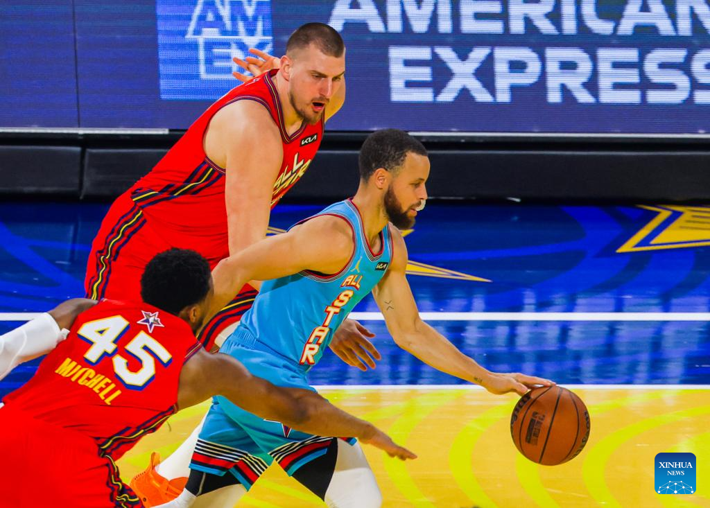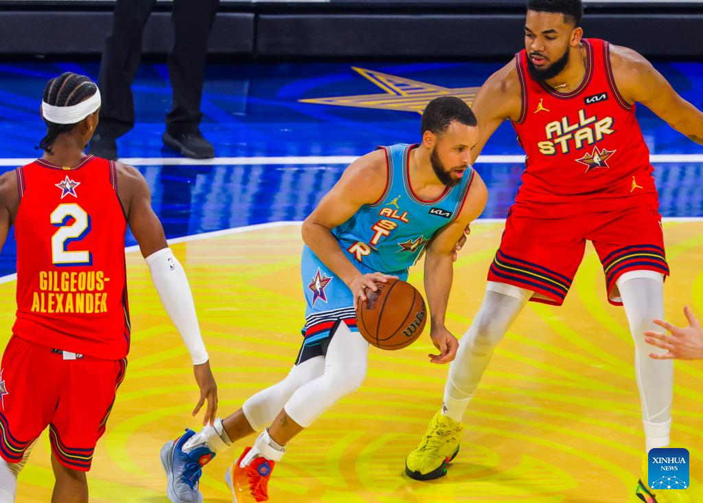 Shaq's OGs' Stephen Curry (C) of Golden State Warriors breaks through during the 2025 NBA All Star Game between Shaq's OGs and Chuck's Global Stars in San Francisco, the United States, Feb. 16, 2025. (Photo by Dong Xudong/Xinhua)