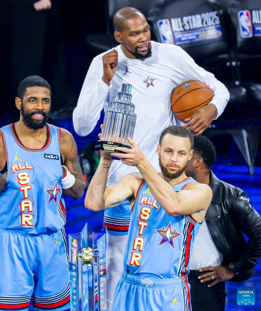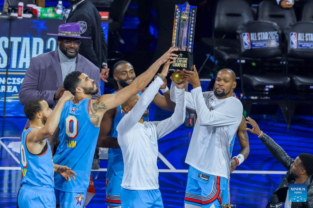 Shaq's OGs' Stephen Curry (3rd R) of Golden State Warriors celebrates with the MVP trophy after the 2025 NBA All Star Game between Shaq's OGs and Chuck's Global Stars in San Francisco, the United States, Feb. 16, 2025. (Photo by Dong Xudong/Xinhua)