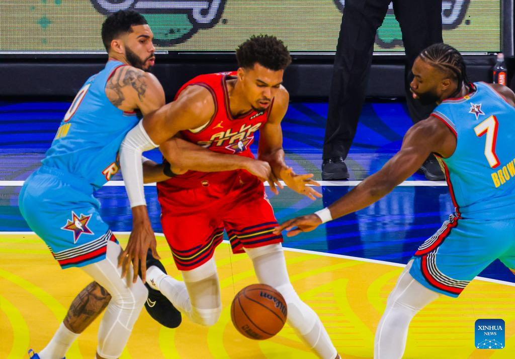 Chuck's Global Stars' Victor Wembanyama (C) of San Antonio Spurs breaks through during the 2025 NBA All Star Game between Shaq's OGs and Chuck's Global Stars in San Francisco, the United States, Feb. 16, 2025. (Photo by Dong Xudong/Xinhua)