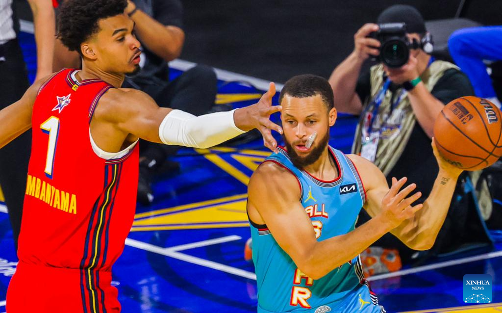 Shaq's OGs' Stephen Curry(R) of Golden State Warriors passes the ball during the 2025 NBA All Star Game between Shaq's OGs and Chuck's Global Stars in San Francisco, the United States, Feb. 16, 2025. (Photo by Dong Xudong/Xinhua)