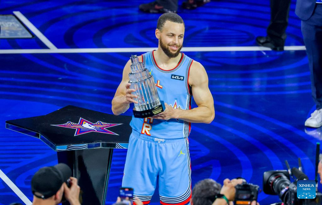 Shaq's OGs' Stephen Curry of Golden State Warriors celebrates with the MVP trophy after the 2025 NBA All Star Game between Shaq's OGs and Chuck's Global Stars in San Francisco, the United States, Feb. 16, 2025. (Photo by Dong Xudong/Xinhua)