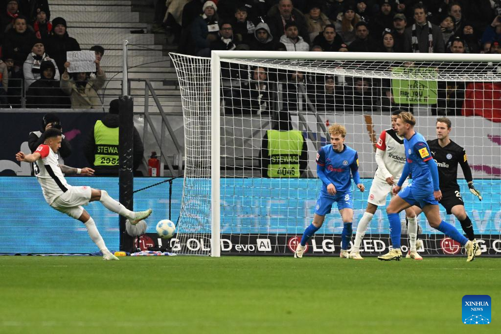 Lucas Tuta (1st L) of Eintracht Frankfurt shoots to score during the German first division of Bundesliga football match between Eintracht Frankfurt and Holstein Kiel in Frankfurt, Germany, Feb. 16, 2025. (Photo by Ulrich Hufnagel/Xinhua)