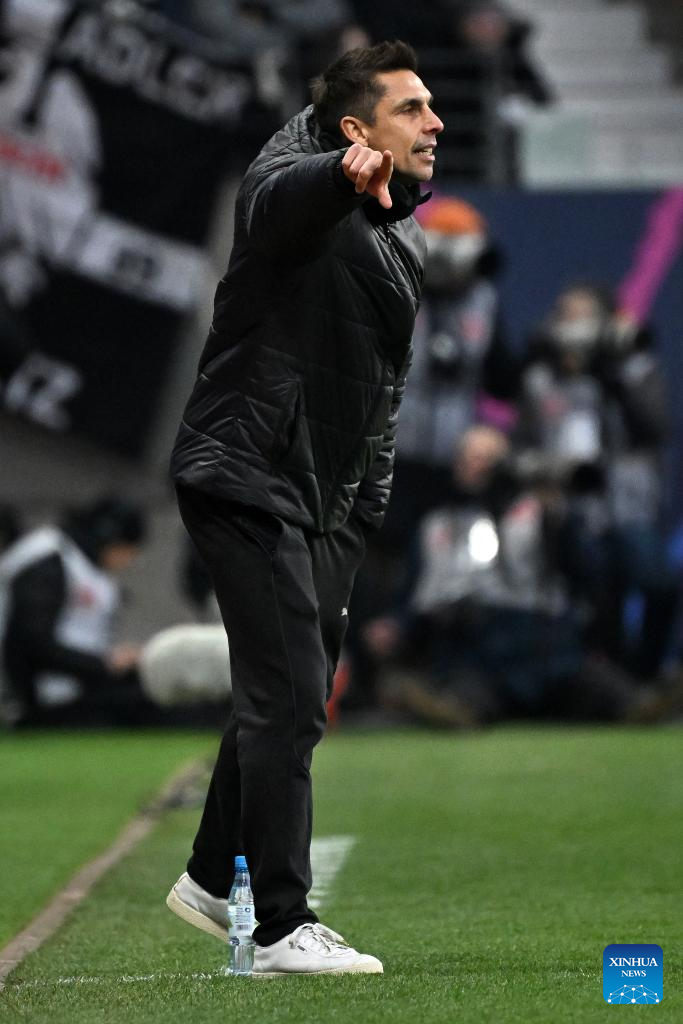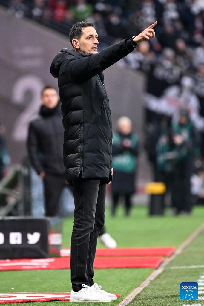 Dino Toppmoeller, head coach of Eintracht Frankfurt, instructs during the German first division of Bundesliga football match between Eintracht Frankfurt and Holstein Kiel in Frankfurt, Germany, Feb. 16, 2025. (Photo by Ulrich Hufnagel/Xinhua)