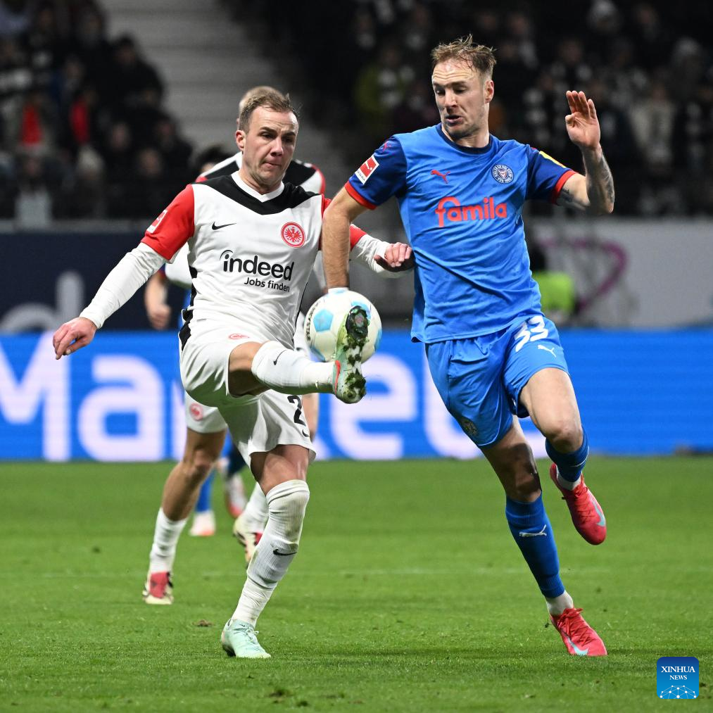 Mario Gotze (L) of Eintracht Frankfurt vies with Dominik Javorcek of Holstein Kiel during the German first division of Bundesliga football match between Eintracht Frankfurt and Holstein Kiel in Frankfurt, Germany, Feb. 16, 2025. (Photo by Ulrich Hufnagel/Xinhua)