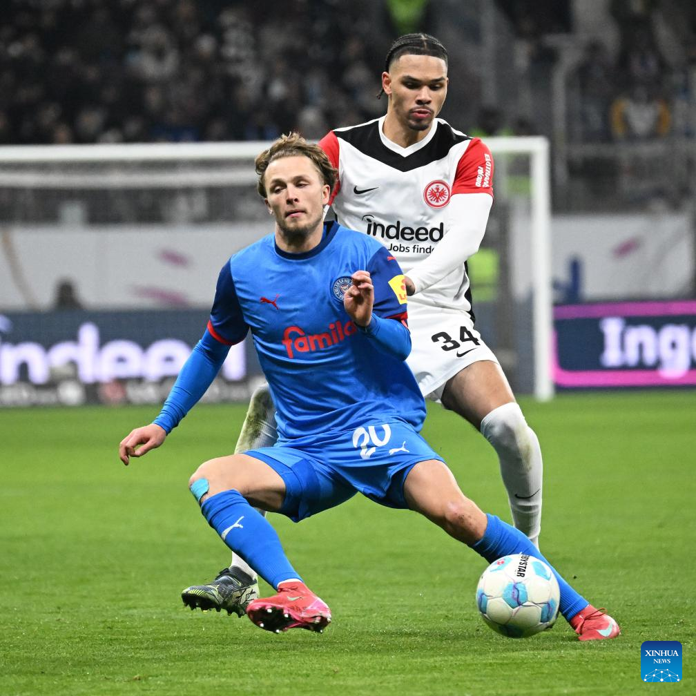 Nnamdi Collins (R) of Eintracht Frankfurt vies with Fiete Arp of Holstein Kiel during the German first division of Bundesliga football match between Eintracht Frankfurt and Holstein Kiel in Frankfurt, Germany, Feb. 16, 2025. (Photo by Ulrich Hufnagel/Xinhua)