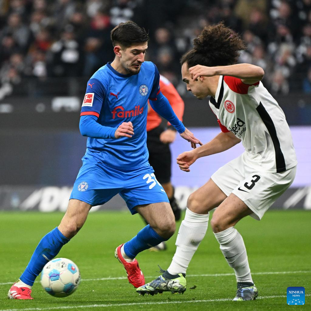 Arthur Theate (R) of Eintracht Frankfurt vies with Armin Gigovic of Holstein Kiel during the German first division of Bundesliga football match between Eintracht Frankfurt and Holstein Kiel in Frankfurt, Germany, Feb. 16, 2025. (Photo by Ulrich Hufnagel/Xinhua)