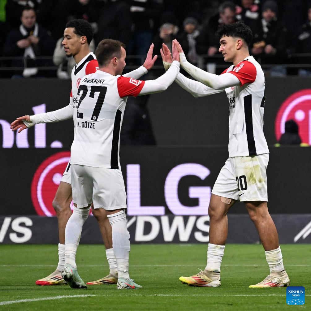 Can Uzun (R) of Eintracht Frankfurt celebrates scoring with his teammates during the German first division of Bundesliga football match between Eintracht Frankfurt and Holstein Kiel in Frankfurt, Germany, Feb. 16, 2025. (Photo by Ulrich Hufnagel/Xinhua)