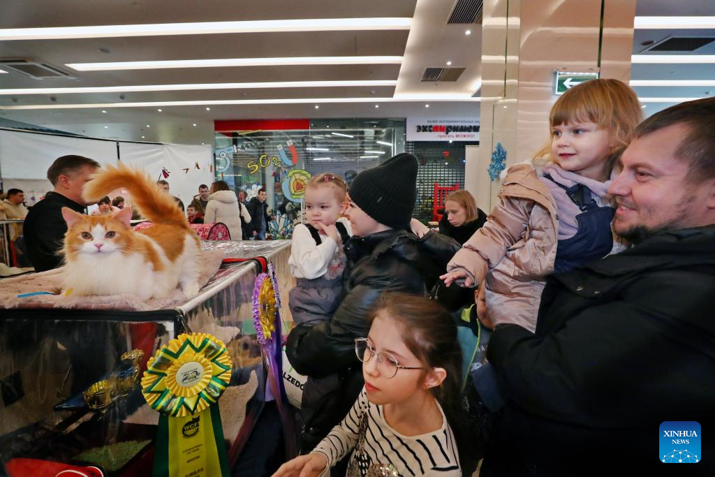 People visit an international cat show held in Minsk, Belarus, Feb. 16, 2025. (Photo by Henadz Zhinkov/Xinhua)