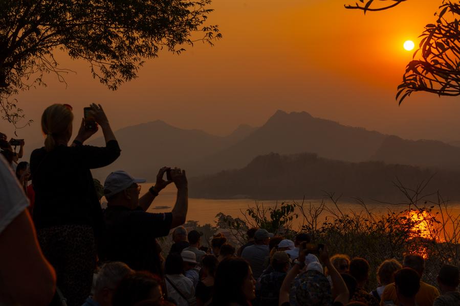 LUANG PRABANG, Laos, Feb. 18 (Xinhua) -- The setting sun slowly sank into the embrace of the distant mountains, and the lake reflected the afterglow of the sky, gently soothing the hearts of visitors at Luang Prabang, Laos.