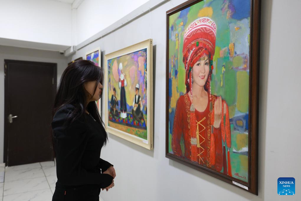 People visit an exhibition of paintings and sculptures about the Silk Road in Bishkek, Kyrgyzstan, on Feb. 18, 2025. The exhibition features more than 60 artworks. (Photo by Roman Gainanov/Xinhua)