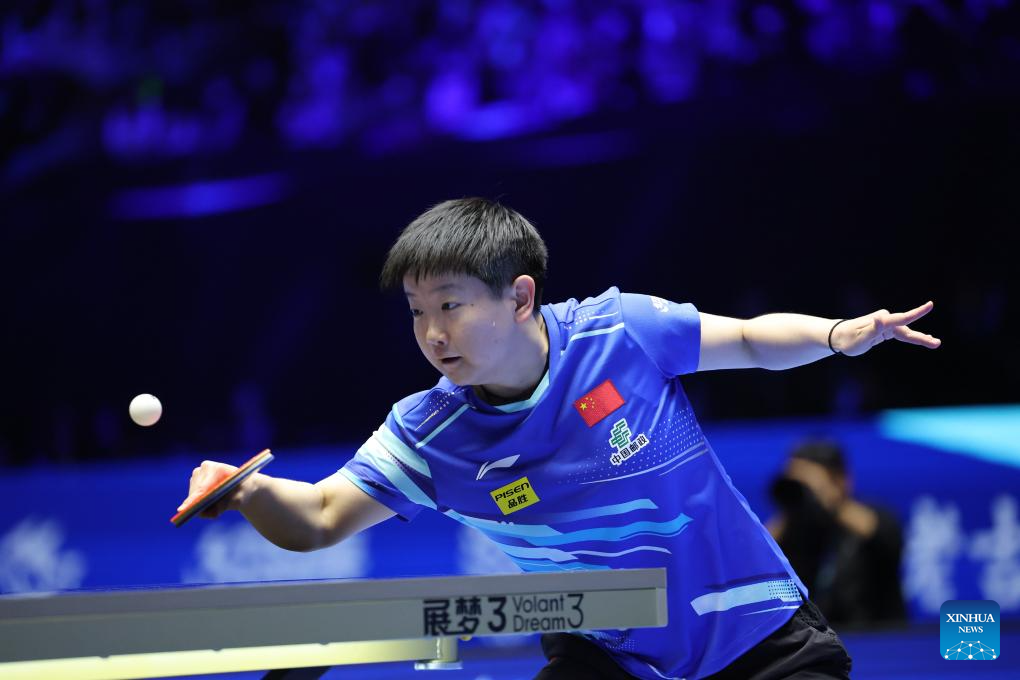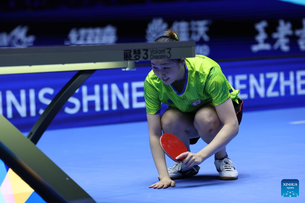 Sun Yingsha of China hits a return during the women's singles Group 1 match against Chien Tung-chuan of Chinese Taipei in Shenzhen, south China's Guangdong Province, Feb. 19, 2025. (Xinhua/Liang Xu)