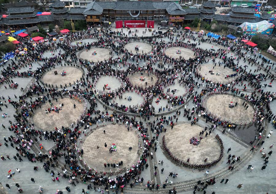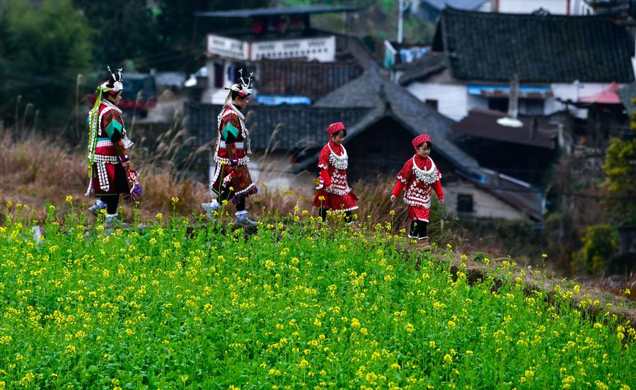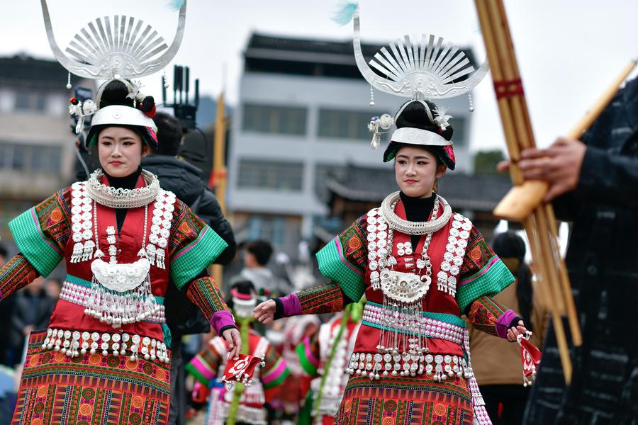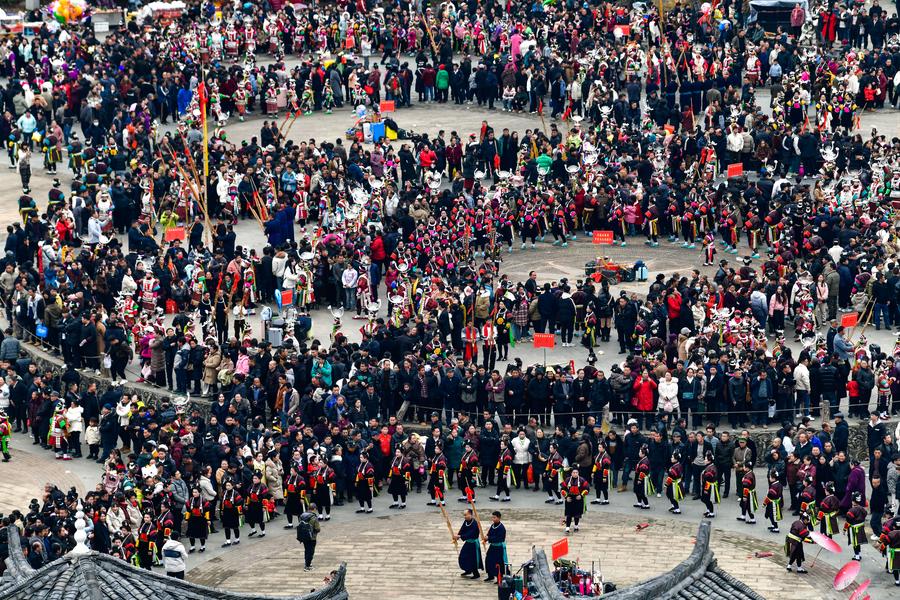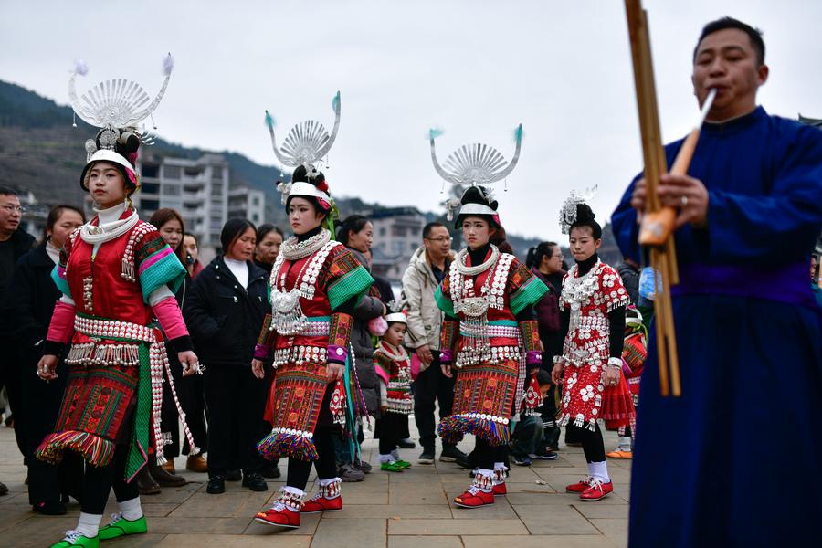 QIANDONGNAN, Feb. 19 (Xinhua) -- Donning in traditional attire, accompanied by the melody of Lusheng, a traditional musical instrument, local people in Kaili rejoiced the annual Gannangxiang festival in Zhouxi Town of Kaili.