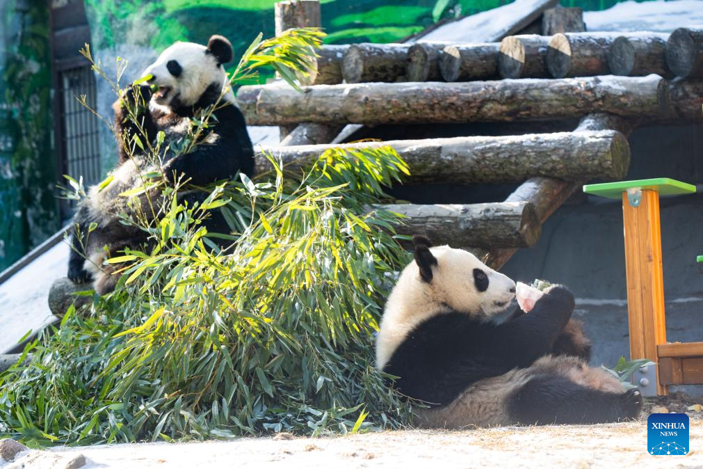 Giant panda Katyusha (R) and its mother Ding Ding enjoy meal at Moscow Zoo in Moscow, Russia, Feb. 18, 2025.