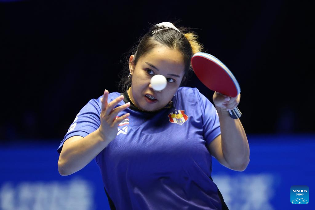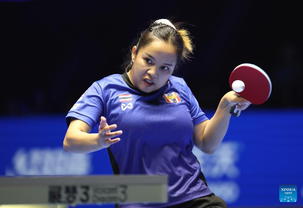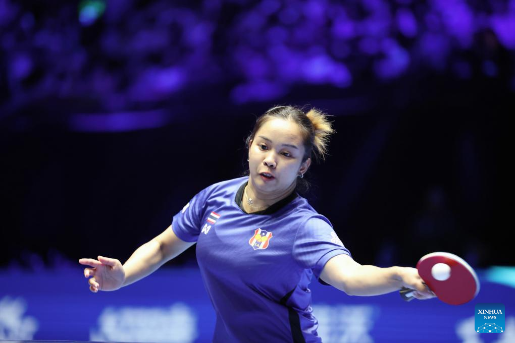 Orawan Paranang of Thailand hits a return during the women's singles group 5 match against Hayata Hina of Japan at the 34th ITTF-ATTU Asian Cup table tennis tournament in Shenzhen, south China's Guangdong Province, Feb. 19, 2025. (Xinhua/Liang Xu)