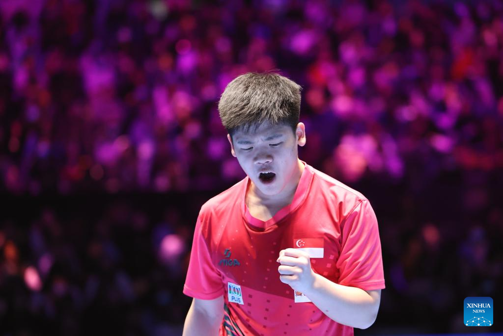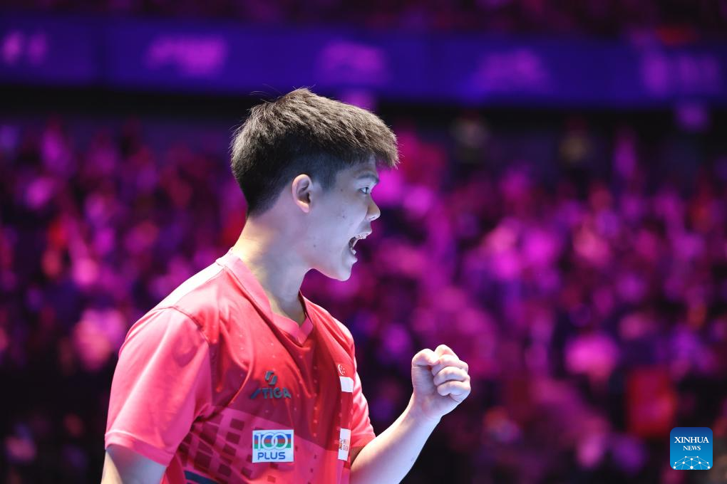 Izaac Quek of Singapore celebrates scoring during the men's singles group 7 match against Chen Yuanyu of China at the 34th ITTF-ATTU Asian Cup table tennis tournament in Shenzhen, south China's Guangdong Province, Feb. 19, 2025. (Xinhua/Liang Xu)