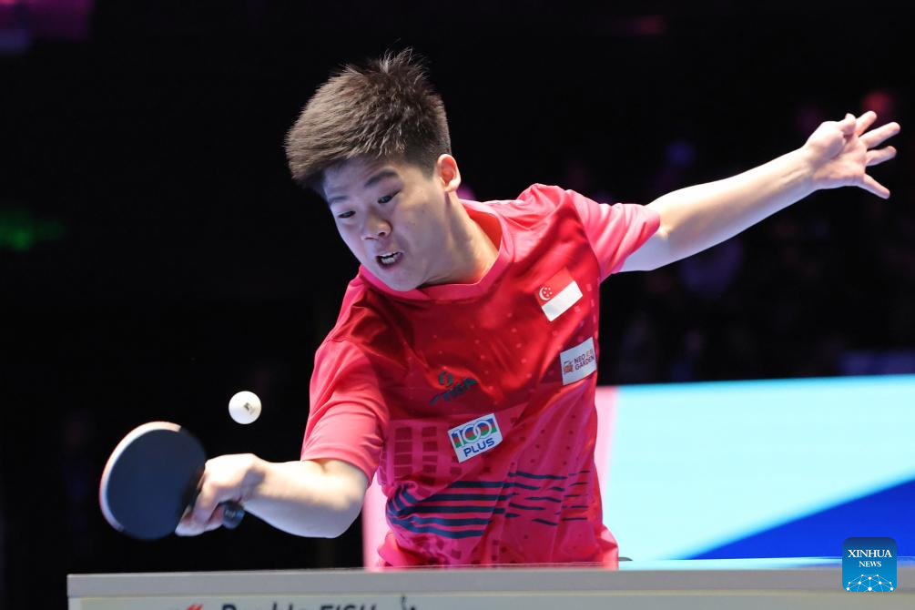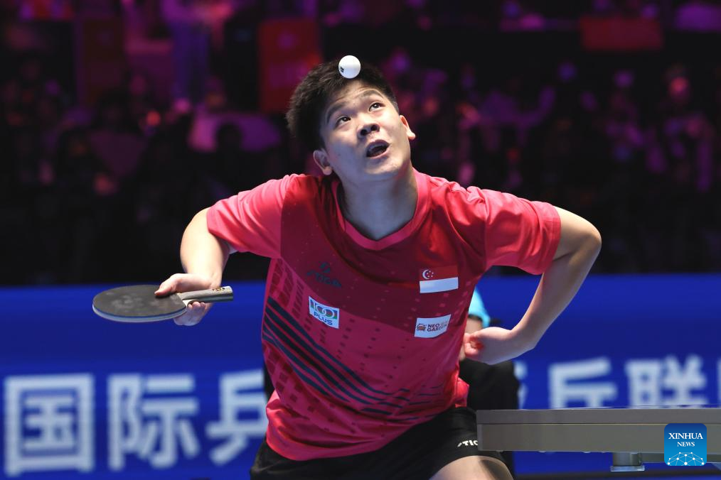 Izaac Quek of Singapore hits a return during the men's singles group 7 match against Chen Yuanyu of China at the 34th ITTF-ATTU Asian Cup table tennis tournament in Shenzhen, south China's Guangdong Province, Feb. 19, 2025. (Xinhua/Liang Xu)