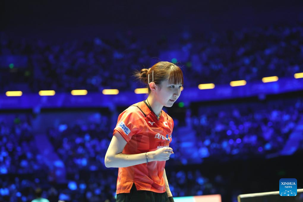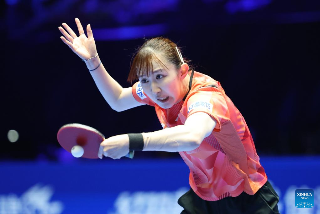 Hayata Hina of Japan hits a return during the women's singles group 5 match against Orawan Paranang of Thailand at the 34th ITTF-ATTU Asian Cup table tennis tournament in Shenzhen, south China's Guangdong Province, Feb. 19, 2025. (Xinhua/Liang Xu)