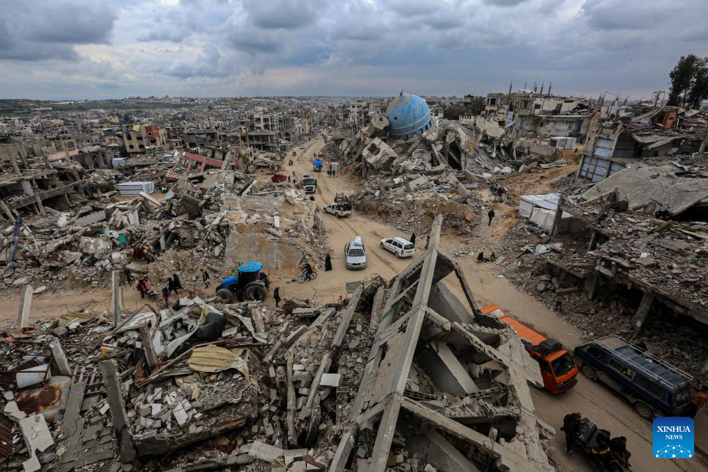 Vehicles are pictured among destroyed houses in Beit Hanoun in the northern Gaza Strip, on Feb. 19, 2025. (Photo by Rizek Abdeljawad/Xinhua)