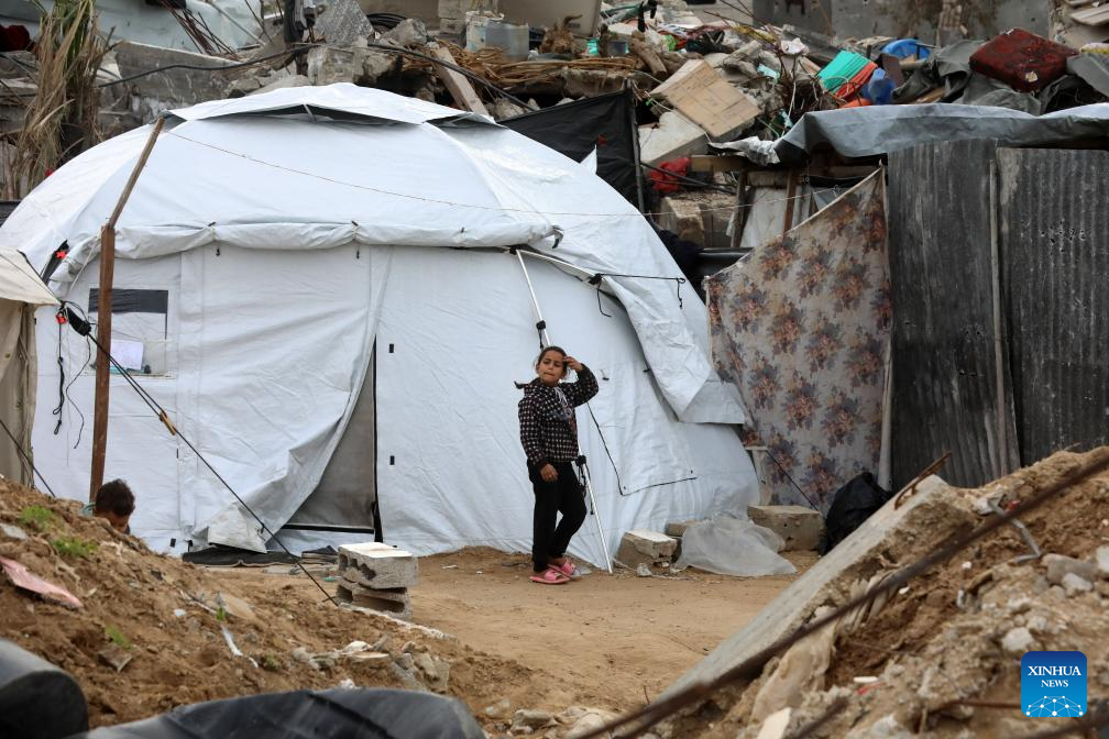 A Palestinian kid is pictured near a tent among destroyed houses in Beit Hanoun in the northern Gaza Strip, on Feb. 19, 2025. (Photo by Rizek Abdeljawad/Xinhua)