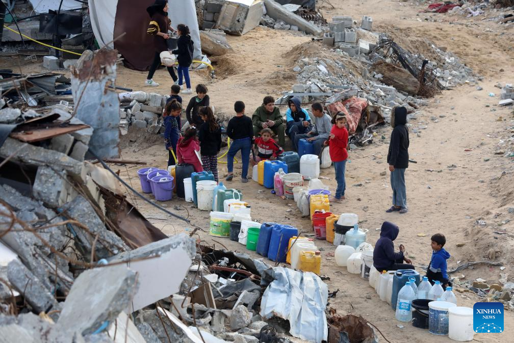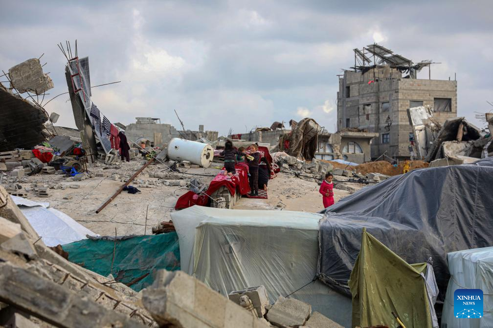 Palestinian children play among destroyed houses in Beit Hanoun in the northern Gaza Strip, on Feb. 19, 2025. (Photo by Rizek Abdeljawad/Xinhua)