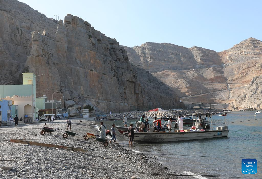 This photo taken on Feb. 19, 2025 shows the entrance to Kumzar Village in Oman. Kumzar, a remote fishing village in the Musandam Peninsula in northern Oman, located in a sheltered harbor near the strategic shipping lane of the Strait of Hormuz. Due to its unique geographical location, Kumzar can only be accessed by boat, making it relatively isolated from the rest of Oman. This isolation has helped preserve its distinct cultural and linguistic identity. The residents of Kumzar primarily rely on fishing for their livelihood, maintaining a traditional maritime way of life. (Xinhua/Wang Qiang)