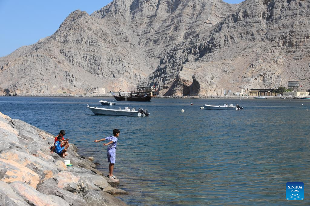 Children enjoy themselves in the water at Kumzar Village in Oman, Feb. 19, 2025. Kumzar, a remote fishing village in the Musandam Peninsula in northern Oman, located in a sheltered harbor near the strategic shipping lane of the Strait of Hormuz. Due to its unique geographical location, Kumzar can only be accessed by boat, making it relatively isolated from the rest of Oman. This isolation has helped preserve its distinct cultural and linguistic identity. The residents of Kumzar primarily rely on fishing for their livelihood, maintaining a traditional maritime way of life. (Xinhua/Wang Qiang)