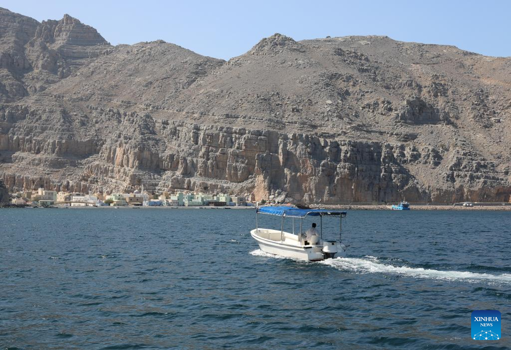 This photo taken on Feb. 19, 2025 shows a distant view of Kumzar Village in Oman. Kumzar, a remote fishing village in the Musandam Peninsula in northern Oman, located in a sheltered harbor near the strategic shipping lane of the Strait of Hormuz. Due to its unique geographical location, Kumzar can only be accessed by boat, making it relatively isolated from the rest of Oman. This isolation has helped preserve its distinct cultural and linguistic identity. The residents of Kumzar primarily rely on fishing for their livelihood, maintaining a traditional maritime way of life. (Xinhua/Wang Qiang)