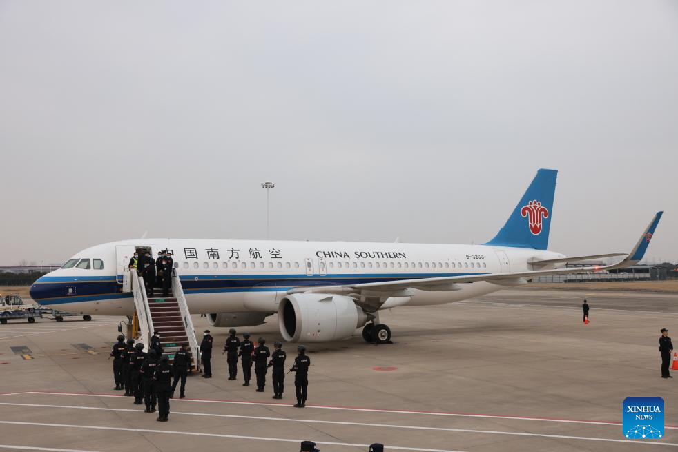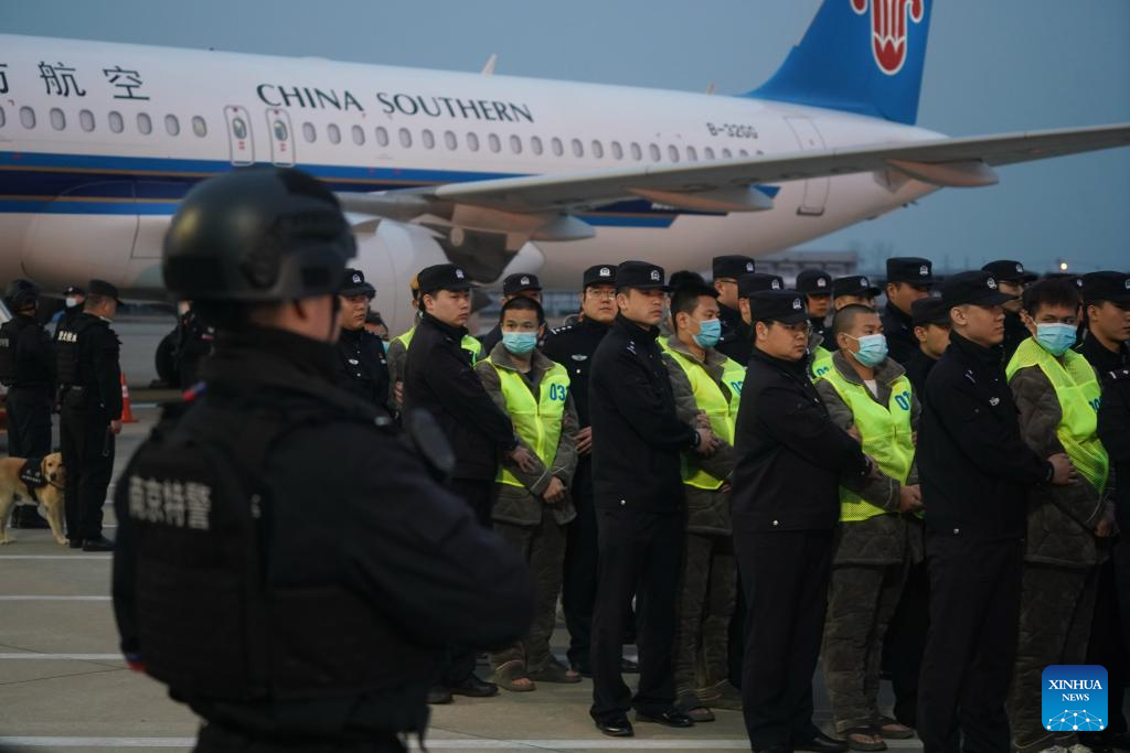 A group of 200 Chinese citizens suspected of involvement in fraud returned to China under the escort of Chinese police on Thursday after being repatriated from Myawaddy in Myanmar. The suspects were first sent to Thailand before being flown back to China on several chartered flights, which arrived at an airport in Nanjing, the capital of eastern Jiangsu Province. The repatriation of these suspects marks a significant achievement of law enforcement cooperation between China, Myanmar and Thailand against telecom fraud, according to a statement by the Ministry of Public Security. (Xinhua/Yin Gang)