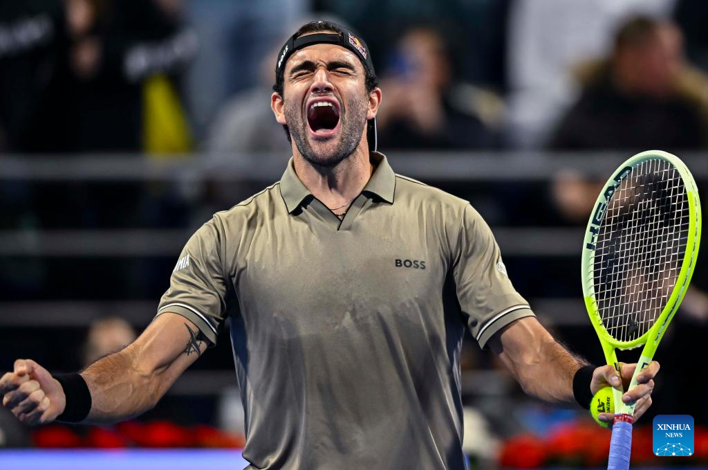 Matteo Berrettini of Italy celebrates after winning the men's singles round 32 match between Matteo Berrettini of Italy and Novak Djokovic of Serbia at the ATP Qatar Open tennis tournament in Doha, Qatar, on Feb. 18, 2025. (Photo by Nikku/Xinhua)