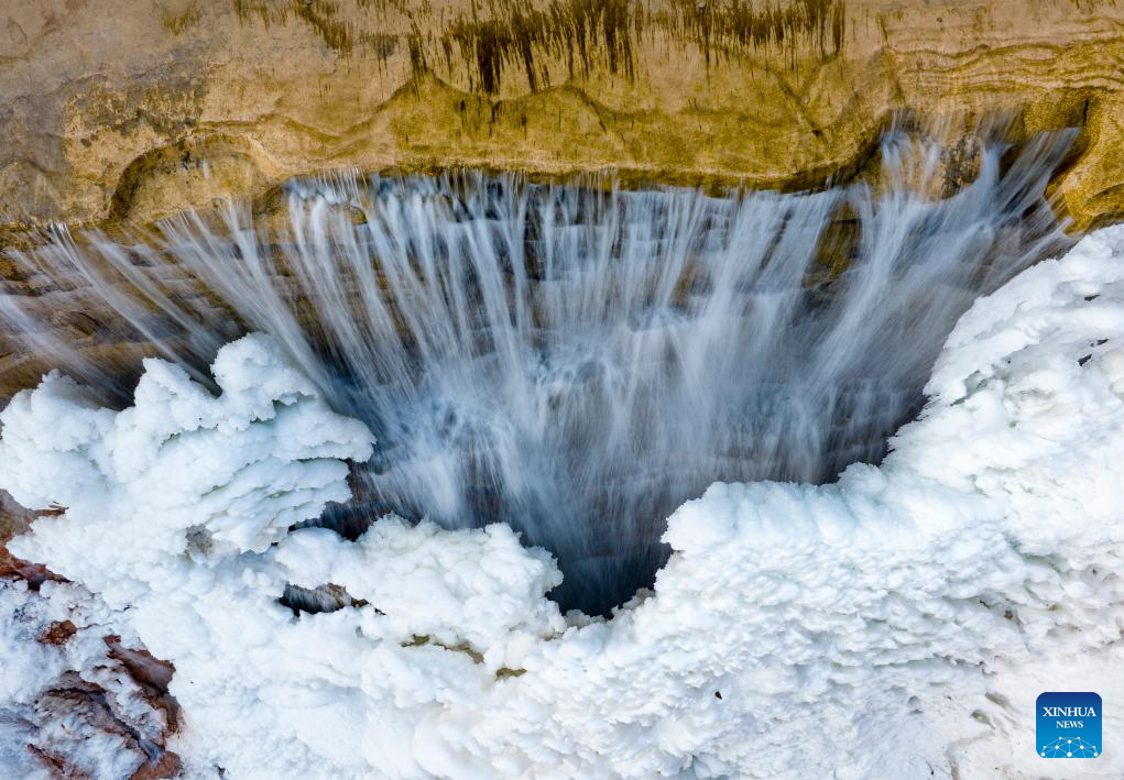 A drone photo taken on Feb. 18, 2025 shows the scenery of Ruhe waterfall in Pengyang County, Guyuan City of northwest China's Ningxia Hui Autonomous Region. (Xinhua/Yang Zhisen)