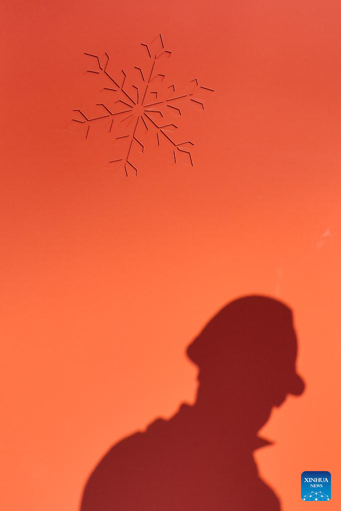 The shadow of a worker is seen cast on a decoration wall with ice and snow element at the construction site of Tonghua Railway Station on the Shenyang-Baihe high-speed railway in northeast China's Jilin Province, Feb. 18, 2025. (Xinhua/Xu Chang)