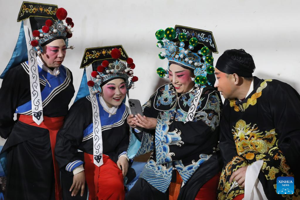 Actors watch their dressed photos when waiting for a performance at a cultural center in Wude Town, Wenxian County of central China's Henan Province, Feb. 18, 2025. (Photo by Xu Hongxing/Xinhua)