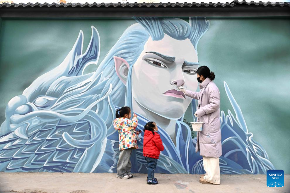 An artist (R) creates a "Ne Zha"-themed wall painting in Shijiazhuang City, north China's Hebei Province, Feb. 19, 2025. (Photo by Chen Qibao/Xinhua)