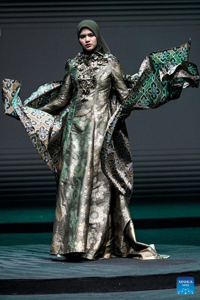 A model presents a creation during a fashion show in Jakarta, Indonesia, Feb. 20, 2025. (Xinhua/Agung Kuncahya B.)
