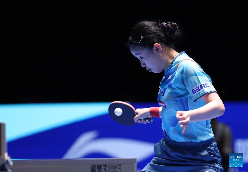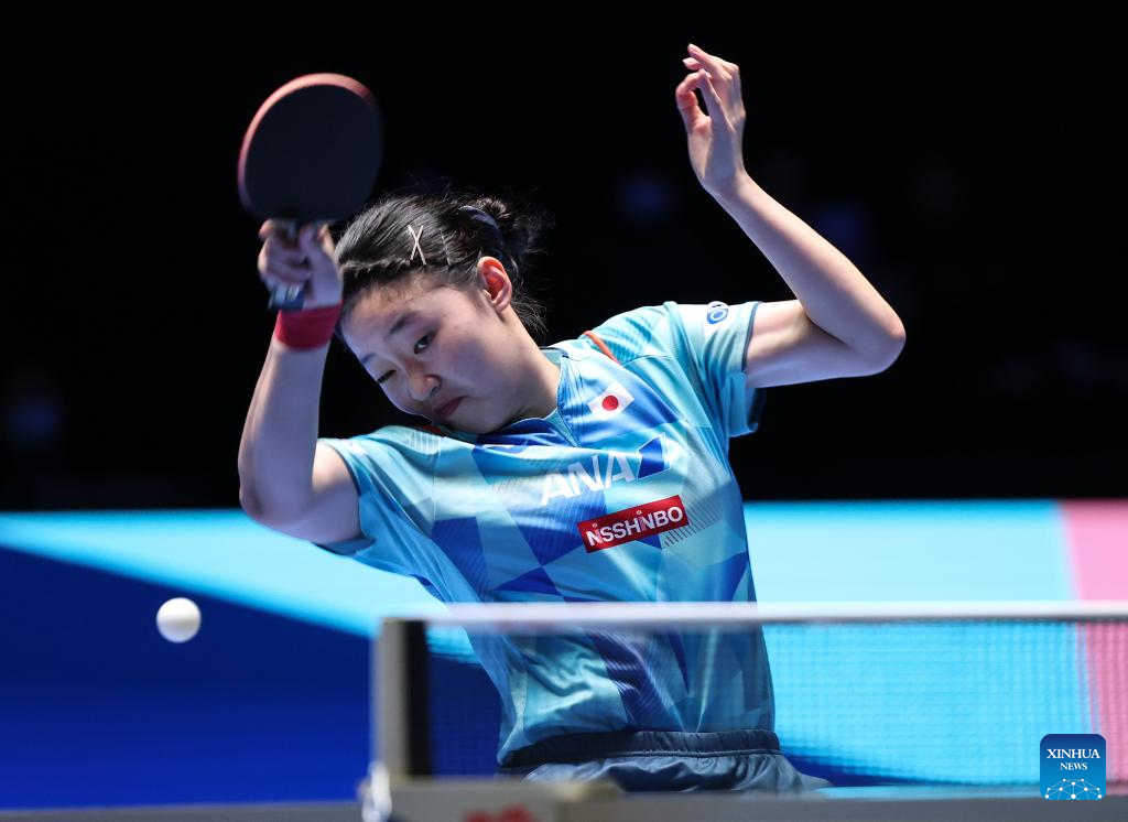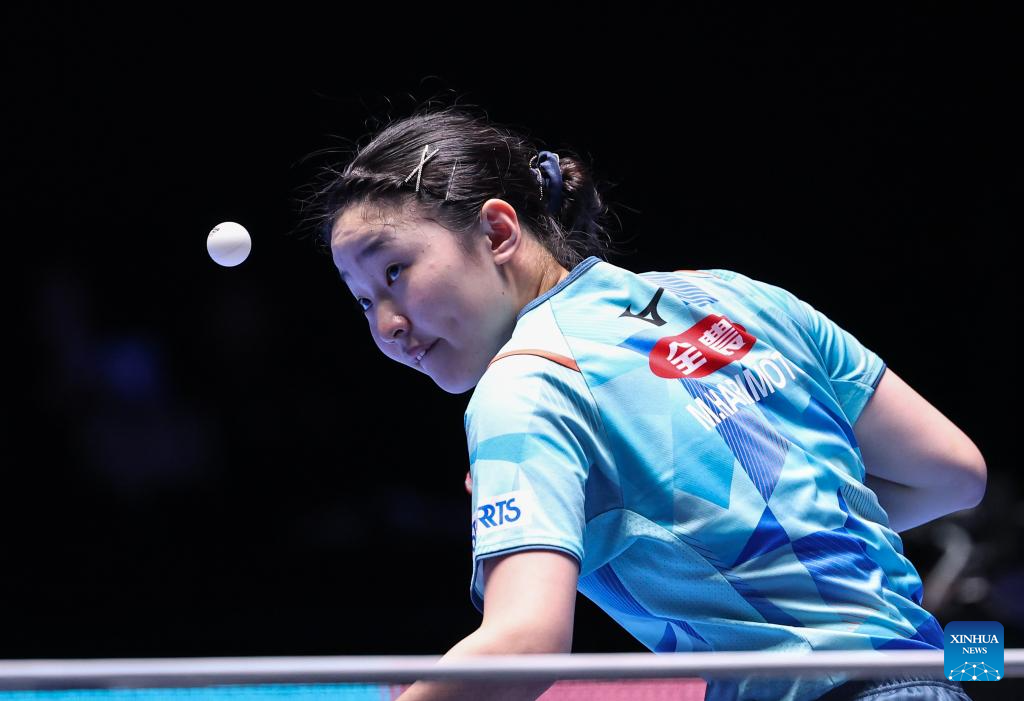 Harimoto Miwa of Japan hits a return during the women's singles Group 6 match against Zauresh Akasheva of Kazakhstan at the 34th ITTF-ATTU Asian Cup table tennis tournament in Shenzhen, south China's Guangdong Province, Feb. 21, 2025. (Xinhua/Mao Siqian)