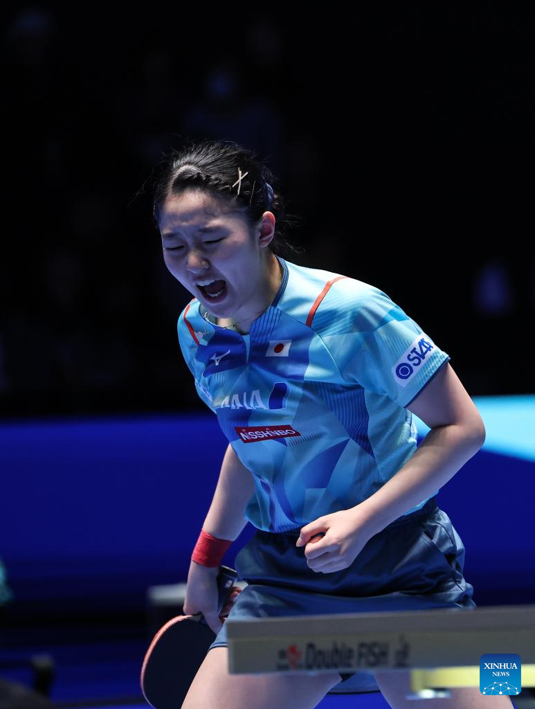 Harimoto Miwa of Japan celebrates scoring during the women's singles Group 6 match against Zauresh Akasheva of Kazakhstan at the 34th ITTF-ATTU Asian Cup table tennis tournament in Shenzhen, south China's Guangdong Province, Feb. 21, 2025. (Xinhua/Mao Siqian)