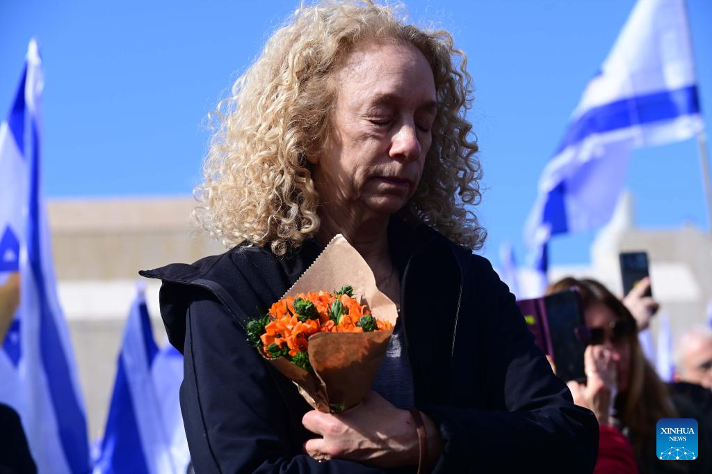 People react as they watch the televised broadcast of the handover of the bodies of Israeli hostages at a square in Tel Aviv, Israel, on Feb. 20, 2025. Palestinian armed groups on Thursday morning handed over the bodies of four Israeli hostages killed in the Gaza Strip during the Israeli war to the International Committee of the Red Cross (ICRC) team, Palestinian sources said. (Tomer Neuberg/JINI via Xinhua)