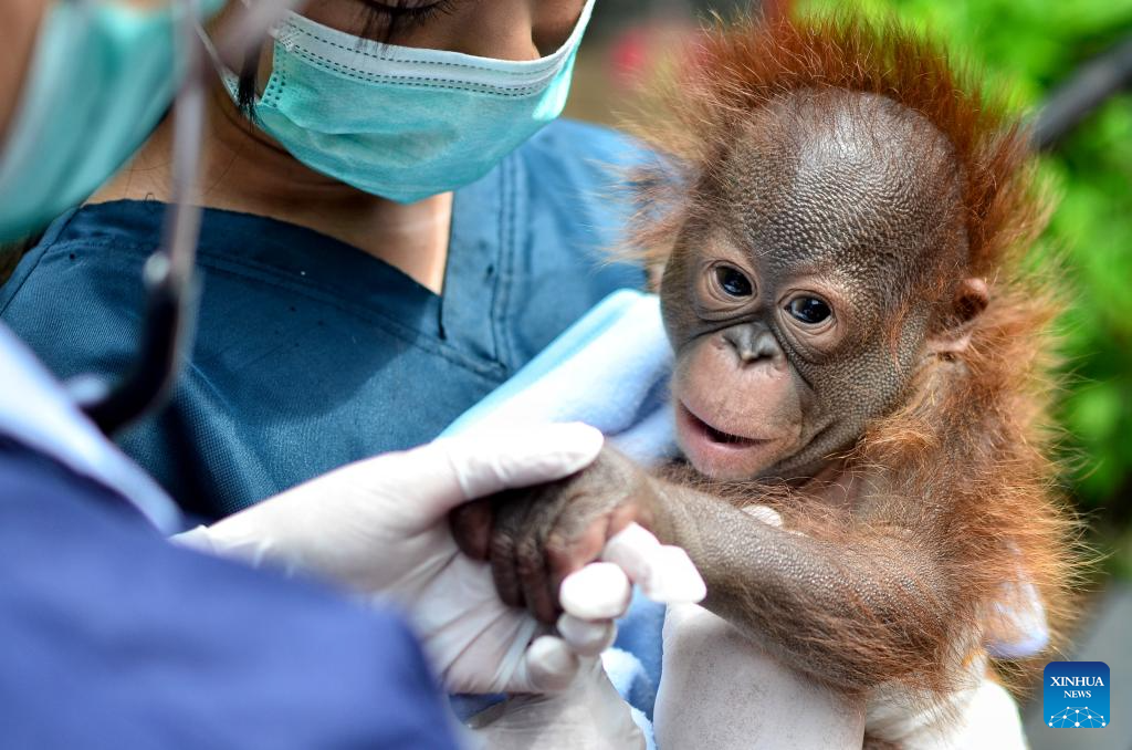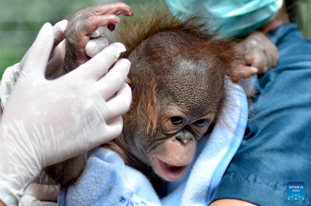 A veterinarian holds a male baby orangutan of two month and seven days old at Bandung Zoo in Bandung, West Java, Indonesia, Feb. 21, 2025. The baby orangutan was born on Dec. 13 here last year. (Photo by Septianjar Muharam/Xinhua)