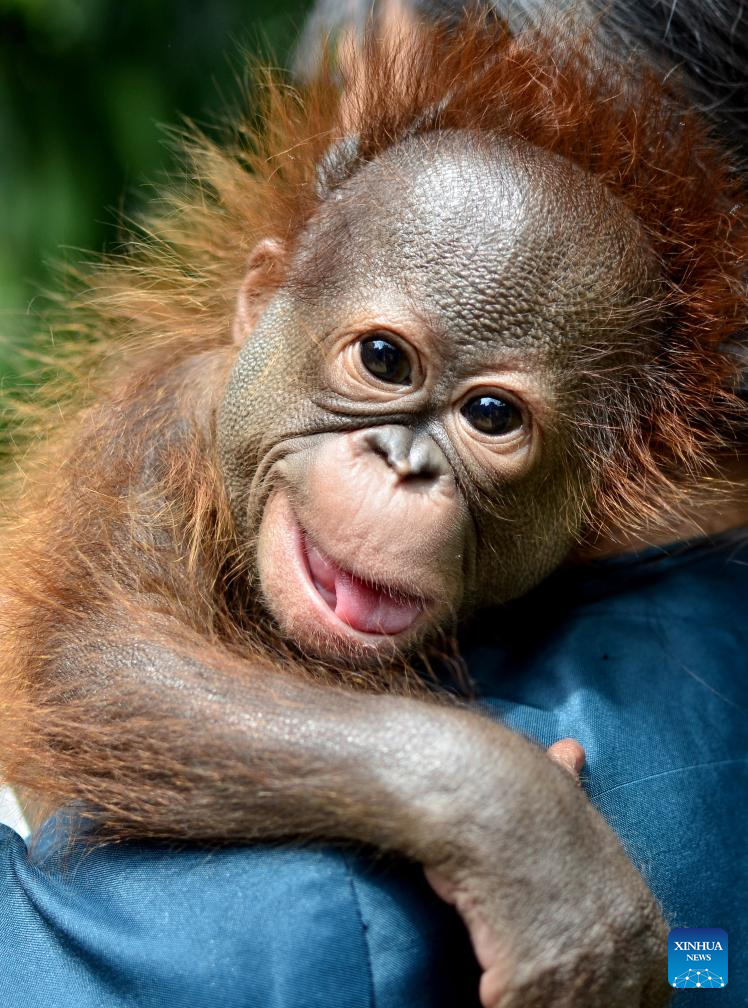 A male baby orangutan of two month and seven days old is pictured at Bandung Zoo in Bandung, West Java, Indonesia, Feb. 21, 2025. The baby orangutan was born on Dec. 13 here last year. (Photo by Septianjar Muharam/Xinhua)