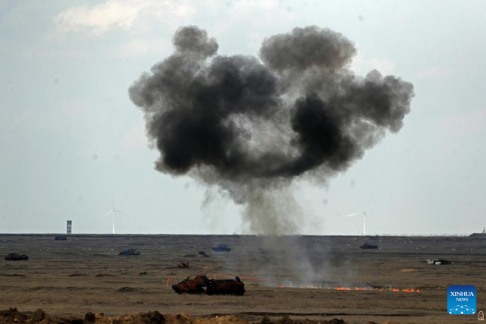 Explosion smoke is seen next to a target during NATO's Steadfast Dart 2025 exercise at a training range in Smardan, Romania, on Feb. 19, 2025. (Photo by Cristian Cristel/Xinhua)