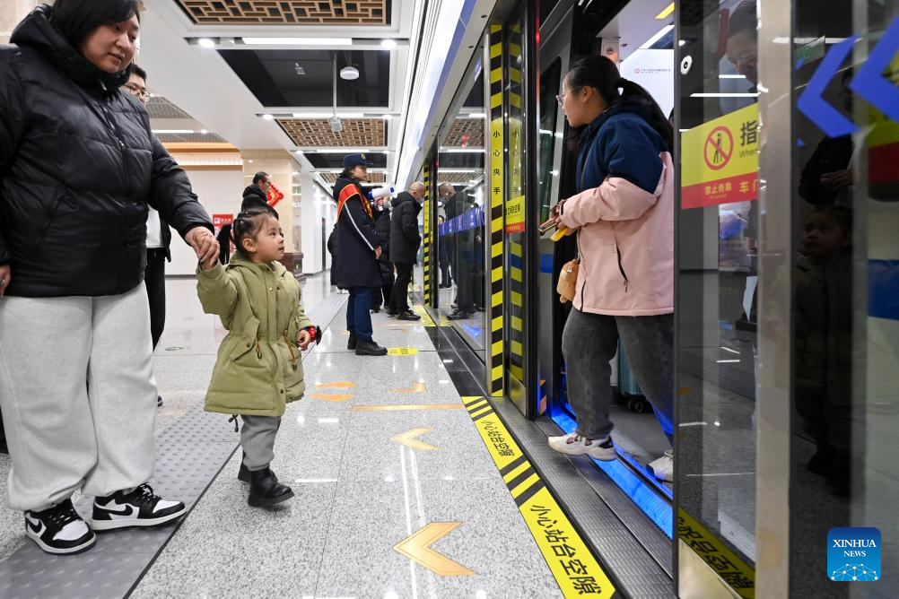 A girl and her family prepare to board a train of Taiyuan Rail Transit Line 1 at Wuyiguangchang Station in Taiyuan, north China's Shanxi Province, Feb. 22, 2025. Shanxi Taiyuan Rail Transit Line 1 was opened for operation on Saturday. With a total length of 28.737 kilometers and 24 stations, the line connects multiple railways, highways and aviation hubs. (Xinhua/Yang Chenguang)