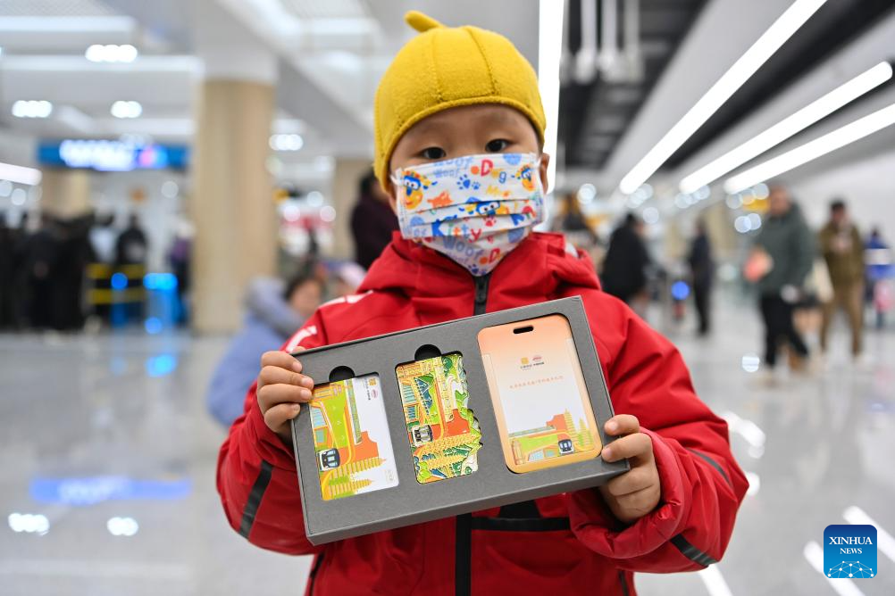 A child displays a set of ticket cards commemorating the opening of Taiyuan Rail Transit Line 1 at Xiayuan Station in Taiyuan, north China's Shanxi Province, Feb. 22, 2025. Shanxi Taiyuan Rail Transit Line 1 was opened for operation on Saturday. With a total length of 28.737 kilometers and 24 stations, the line connects multiple railways, highways and aviation hubs. (Xinhua/Yang Chenguang)