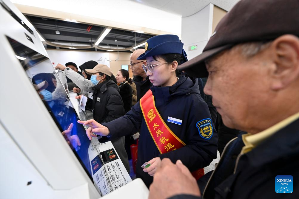 A staff member helps a passenger buy a ticket at Xutandongjie station of Taiyuan Rail Transit Line 1 in Taiyuan, north China's Shanxi Province, Feb. 22, 2025. Shanxi Taiyuan Rail Transit Line 1 was opened for operation on Saturday. With a total length of 28.737 kilometers and 24 stations, the line connects multiple railways, highways and aviation hubs. (Xinhua/Yang Chenguang)
