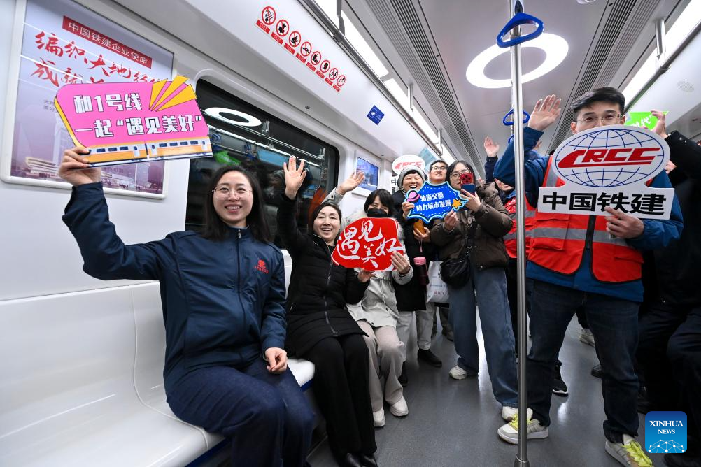 Some of the builders of Taiyuan Rail Transit Line 1 pose for a group photo with passengers on a train running the line in Taiyuan, north China's Shanxi Province, Feb. 22, 2025. Shanxi Taiyuan Rail Transit Line 1 was opened for operation on Saturday. With a total length of 28.737 kilometers and 24 stations, the line connects multiple railways, highways and aviation hubs. (Xinhua/Yang Chenguang)