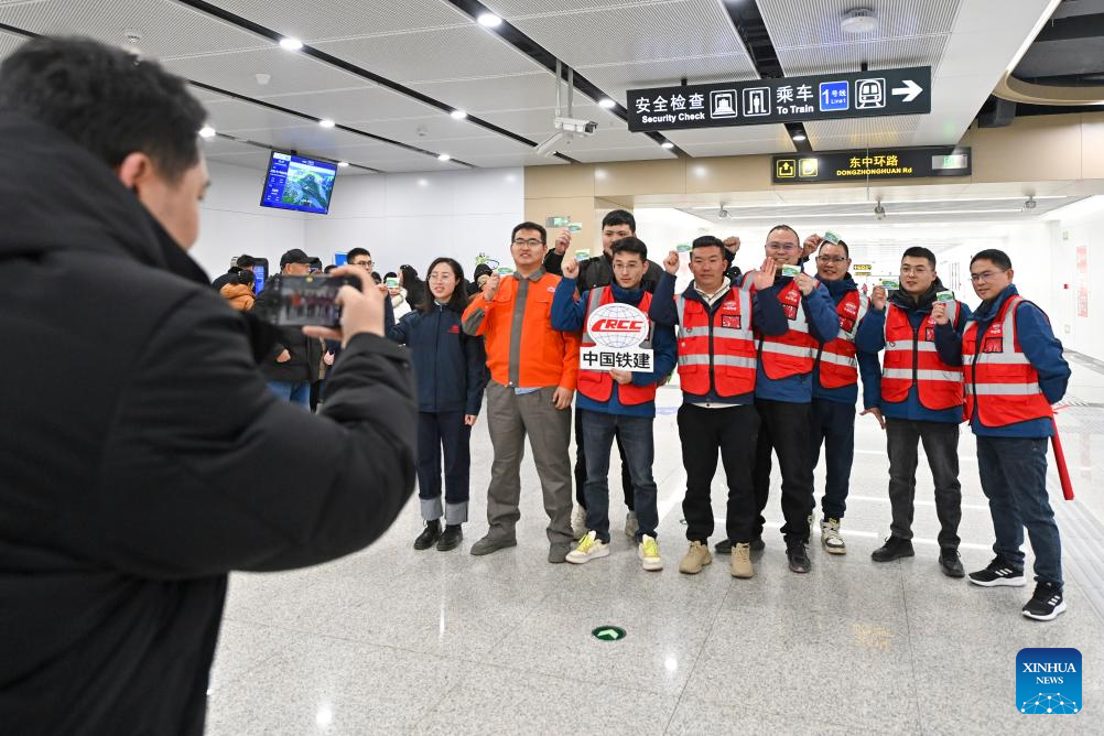 Some of the builders of Taiyuan Rail Transit Line 1 pose for a group photo at Xutandongjie station of the line in Taiyuan, north China's Shanxi Province, Feb. 22, 2025. Shanxi Taiyuan Rail Transit Line 1 was opened for operation on Saturday. With a total length of 28.737 kilometers and 24 stations, the line connects multiple railways, highways and aviation hubs. (Xinhua/Yang Chenguang)
